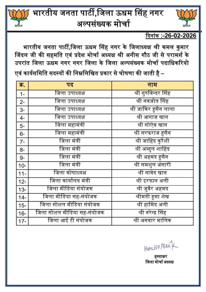 चुनावों के मद्देनज़र ये हमेशा माना जाता है कि बीजेपी हमेशा चुनावी मोड में एक्टिव रहती है। और जिस तरीके से अब बीजेपी नें अपने एक के बाद एक सभी प्रकोष्ठ कि घोषणा की है उससे साफ है की बीजेपी की तैयारियां अपने चरम पर हैं और वहीं कल बीजेपी नें जिला अल्पसंख्यक मोर्चे की भी घोषणा ऊधमसिंह नगर के जिला अध्यक्ष कमल जिंदल द्वारा कर दी गई है। जिसमें कुल 17 लोगों को अल्पसंख्यक मोर्चे के विभिन्न पदों की जिम्मेदारी सोपी गई है। बीजेपी किसी भी तरह से अल्पसंख्यको को नजरअंदाज नहीं कर सकती और इसीलिए बीजेपी नें अल्पसंख्यक मोर्चे में पदों के वितरण में हर तबके का ध्यान भी रखा है जिसके चलते नवजोत सिंह को अल्पसंख्यक मोर्चे का जिला उपाध्यक्ष घोषित किया है।